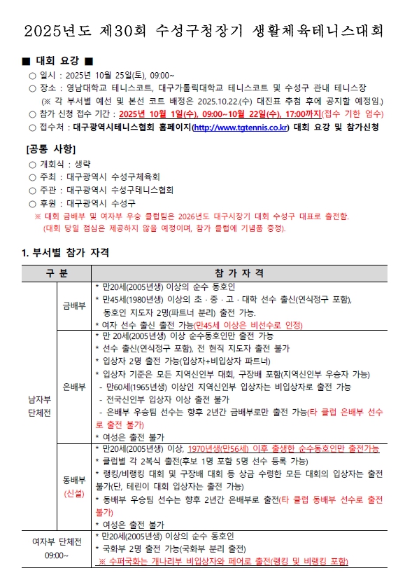 ¡Û Âü°¡ ½Åû Á¢¼ö ±â°£ : 2025³â 10¿ù 1ÀÏ(¼ö), 09:00~10¿ù 22ÀÏ(¼ö), 17:00±îÁö(Á¢¼ö ±âÇÑ ¾ö¼ö) ¡Û Á¢¼öó : ´ë±¸±¤¿ª½ÃÅ״ϽºÇùȸ ȨÆäÀÌÁö(http://www.tgtennis.co.kr) ´ëȸ ¿ä°­ ¹× Âü°¡ ½Åû