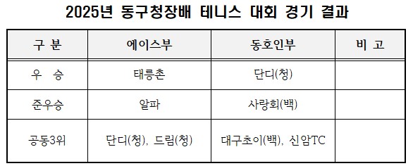 2025³â µ¿±¸ ûÀå¹è Å״Ͻº ´ëȸ °á°úÀÔ´Ï´Ù.